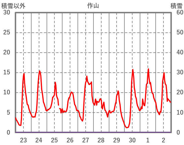 | 日 | 時 | 気温 | 降水 | 風向/風速 | 日照 | 積雪 | 降雪 |