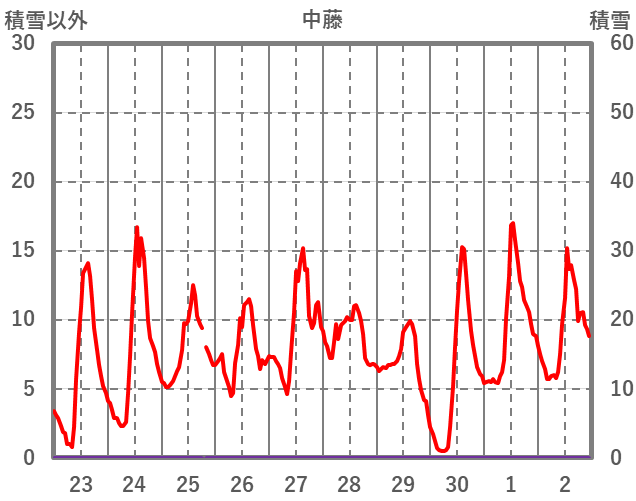 | 日 | 時 | 気温 | 降水 | 風向/風速 | 日照 | 積雪 | 降雪 |