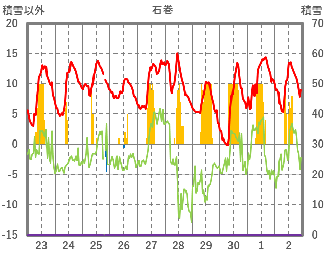 | 日 | 時 | 気温 | 降水 | 風向/風速 | 日照 | 積雪 | 降雪 |