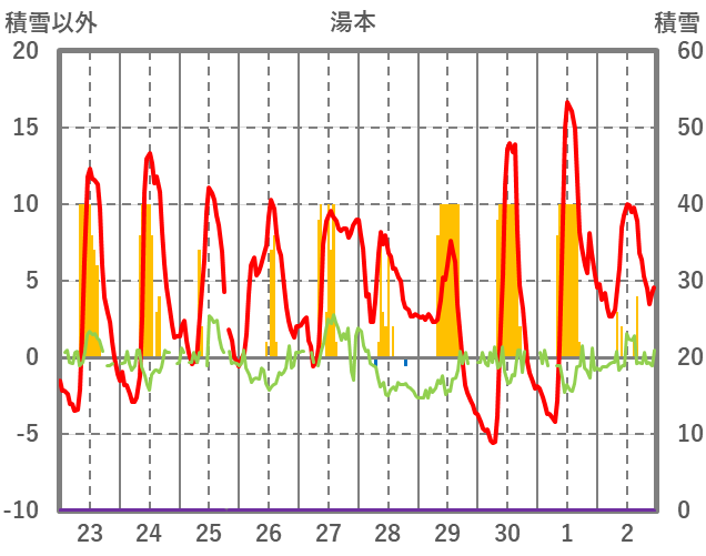 | 日 | 時 | 気温 | 降水 | 風向/風速 | 日照 | 積雪 | 降雪 |