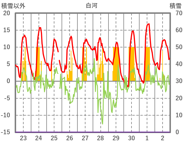| 日 | 時 | 気温 | 降水 | 風向/風速 | 日照 | 積雪 | 降雪 |