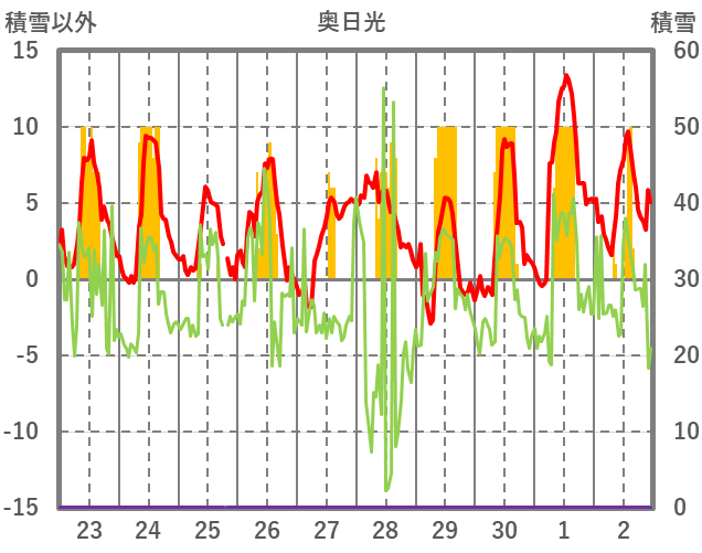 | 日 | 時 | 気温 | 降水 | 風向/風速 | 日照 | 積雪 | 降雪 |