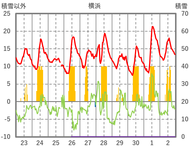 | 日 | 時 | 気温 | 降水 | 風向/風速 | 日照 | 積雪 | 降雪 |