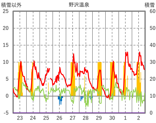 | 日 | 時 | 気温 | 降水 | 風向/風速 | 日照 | 積雪 | 降雪 |