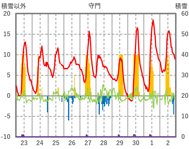 | 日 | 時 | 気温 | 降水 | 風向/風速 | 日照 | 積雪 | 降雪 |