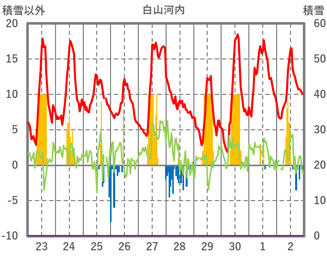 | 日 | 時 | 気温 | 降水 | 風向/風速 | 日照 | 積雪 | 降雪 |
