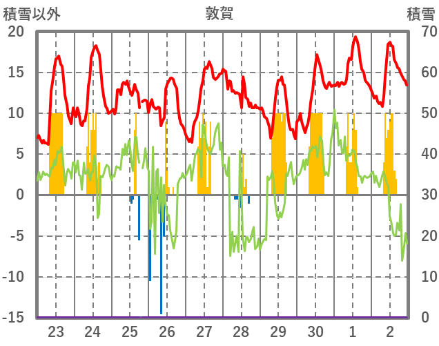 | 日 | 時 | 気温 | 降水 | 風向/風速 | 日照 | 積雪 | 降雪 |