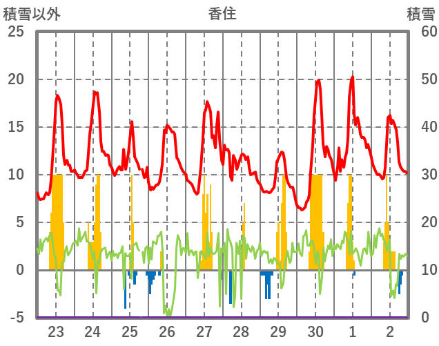 | 日 | 時 | 気温 | 降水 | 風向/風速 | 日照 | 積雪 | 降雪 |