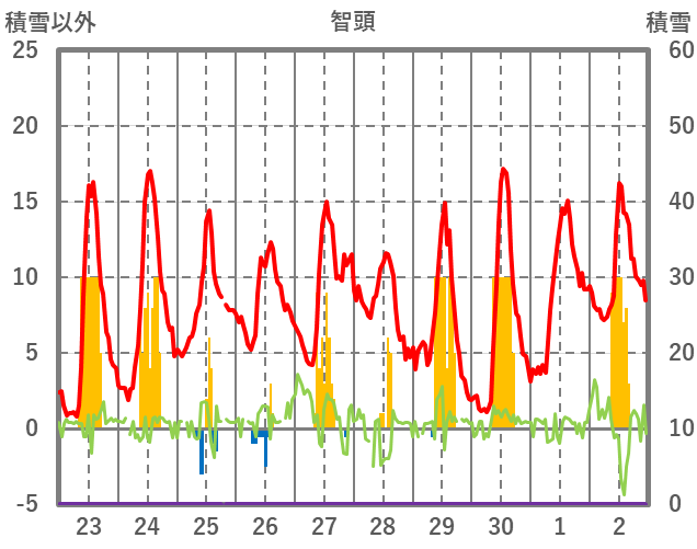 | 日 | 時 | 気温 | 降水 | 風向/風速 | 日照 | 積雪 | 降雪 |