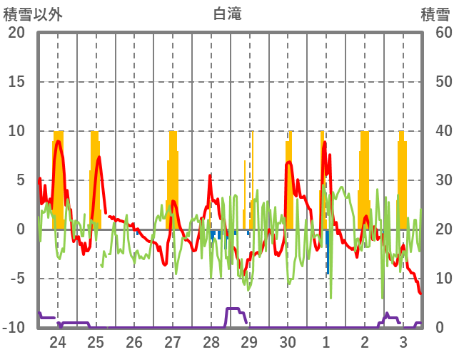 | 日 | 時 | 気温 | 降水 | 風向/風速 | 日照 | 積雪 | 降雪 |
