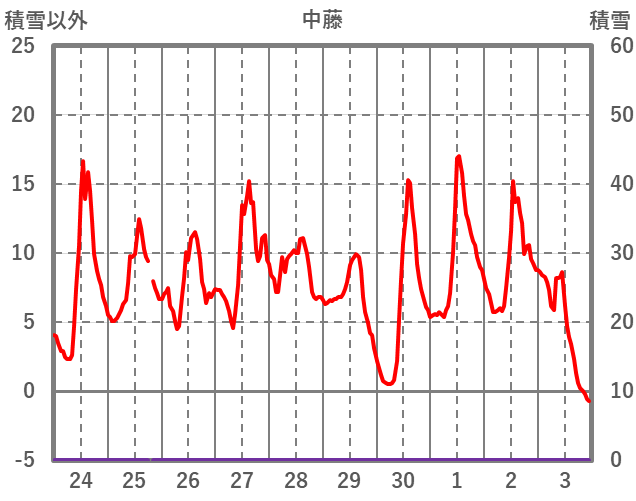 | 日 | 時 | 気温 | 降水 | 風向/風速 | 日照 | 積雪 | 降雪 |