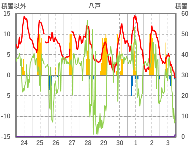 | 日 | 時 | 気温 | 降水 | 風向/風速 | 日照 | 積雪 | 降雪 |