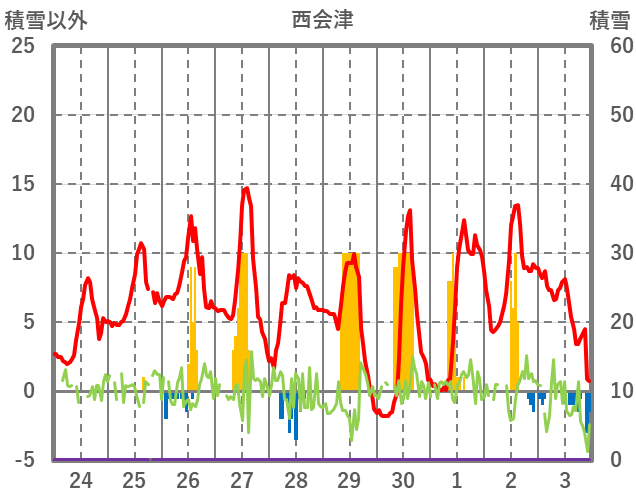| 日 | 時 | 気温 | 降水 | 風向/風速 | 日照 | 積雪 | 降雪 |