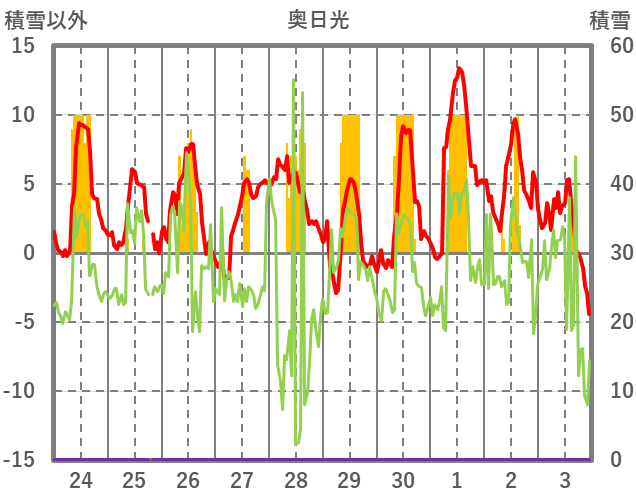 | 日 | 時 | 気温 | 降水 | 風向/風速 | 日照 | 積雪 | 降雪 |