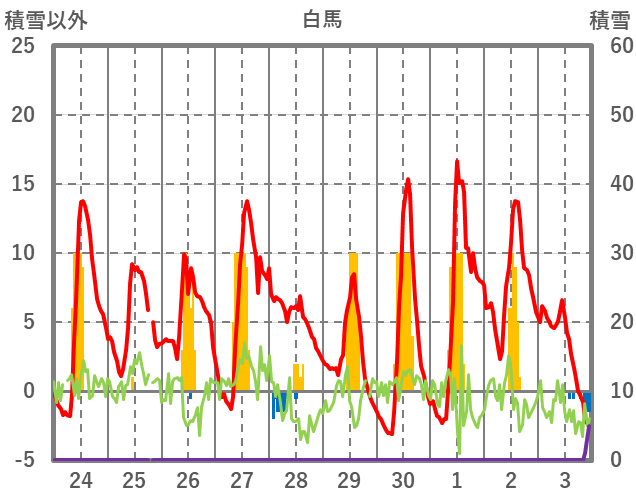 | 日 | 時 | 気温 | 降水 | 風向/風速 | 日照 | 積雪 | 降雪 |