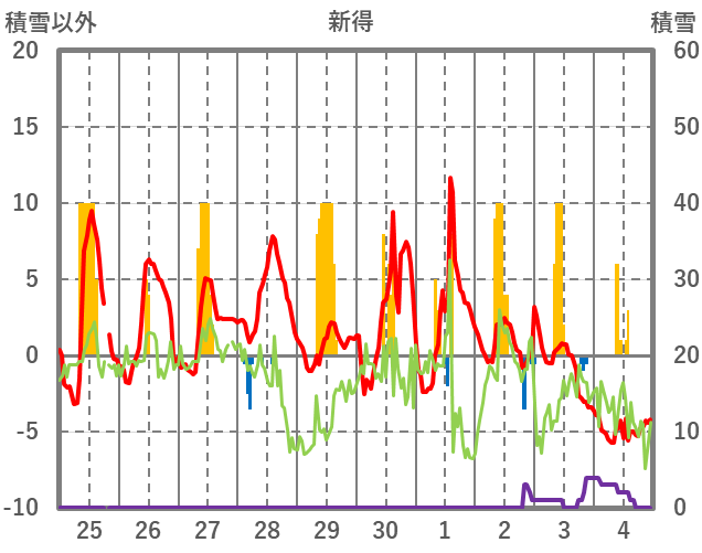 | 日 | 時 | 気温 | 降水 | 風向/風速 | 日照 | 積雪 | 降雪 |