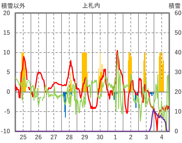 | 日 | 時 | 気温 | 降水 | 風向/風速 | 日照 | 積雪 | 降雪 |