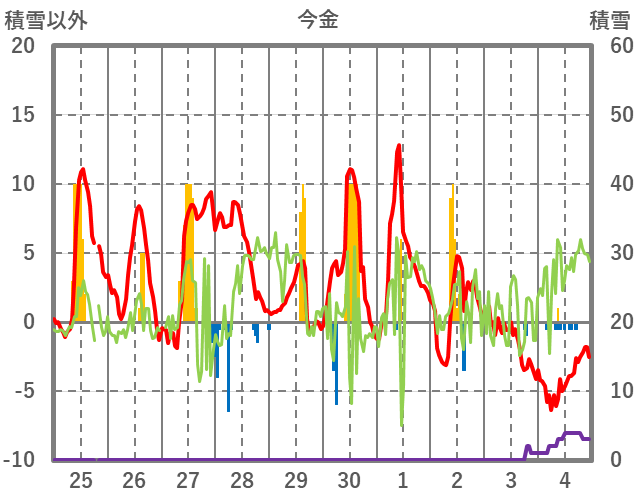 | 日 | 時 | 気温 | 降水 | 風向/風速 | 日照 | 積雪 | 降雪 |