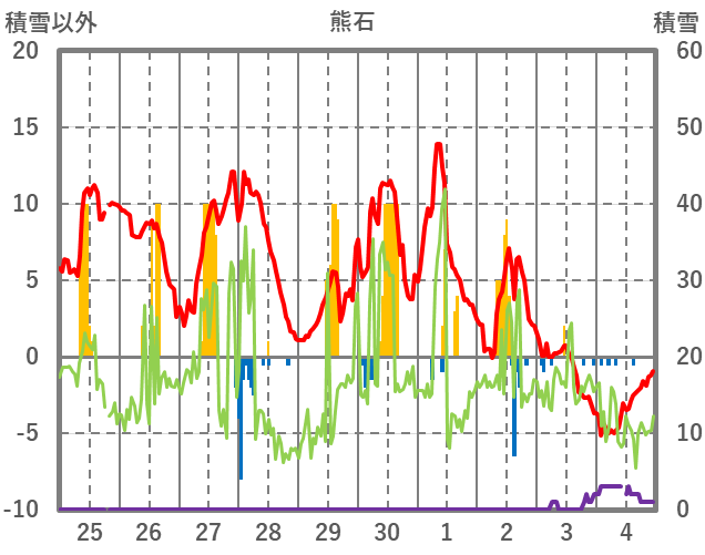 | 日 | 時 | 気温 | 降水 | 風向/風速 | 日照 | 積雪 | 降雪 |