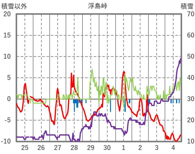 | 日 | 時 | 気温 | 降水 | 風向/風速 | 日照 | 積雪 | 降雪 |