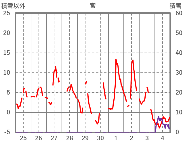 | 日 | 時 | 気温 | 降水 | 風向/風速 | 日照 | 積雪 | 降雪 |