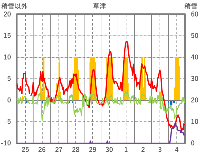 | 日 | 時 | 気温 | 降水 | 風向/風速 | 日照 | 積雪 | 降雪 |