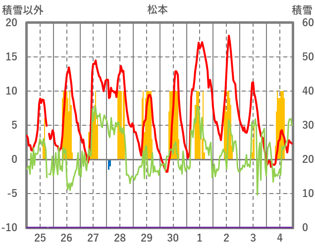 | 日 | 時 | 気温 | 降水 | 風向/風速 | 日照 | 積雪 | 降雪 |