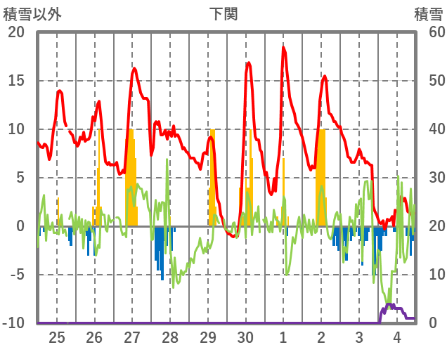 | 日 | 時 | 気温 | 降水 | 風向/風速 | 日照 | 積雪 | 降雪 |