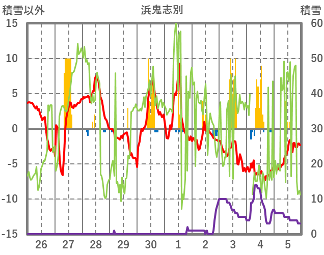 | 日 | 時 | 気温 | 降水 | 風向/風速 | 日照 | 積雪 | 降雪 |