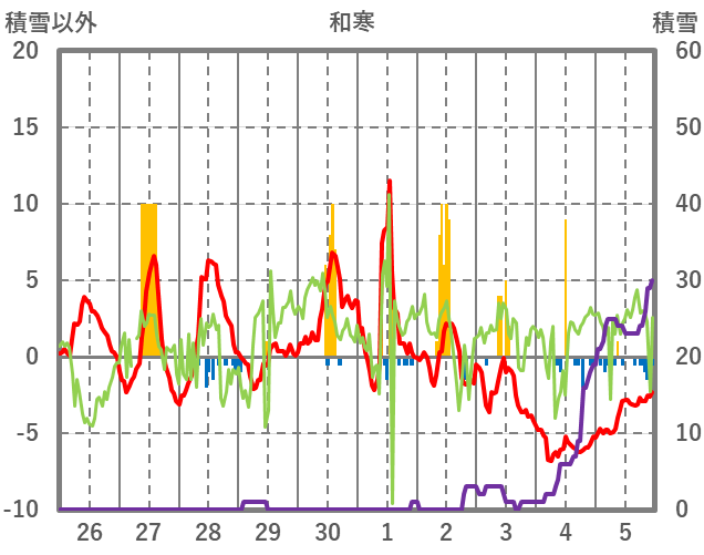 | 日 | 時 | 気温 | 降水 | 風向/風速 | 日照 | 積雪 | 降雪 |