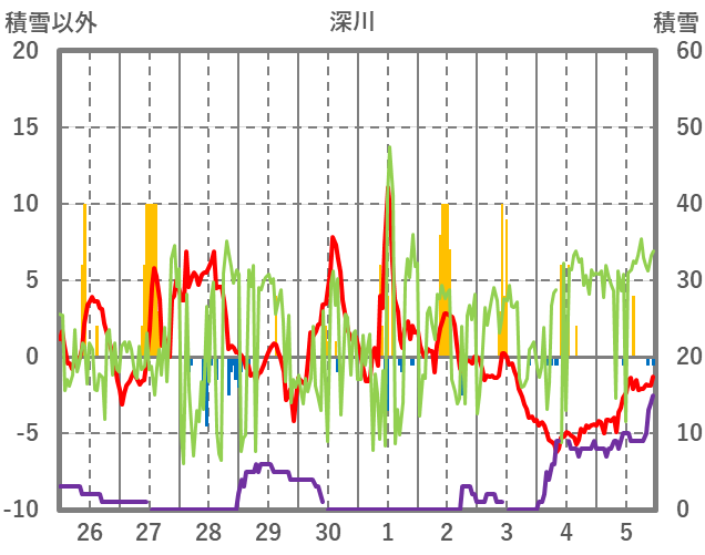 | 日 | 時 | 気温 | 降水 | 風向/風速 | 日照 | 積雪 | 降雪 |