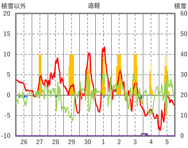 | 日 | 時 | 気温 | 降水 | 風向/風速 | 日照 | 積雪 | 降雪 |