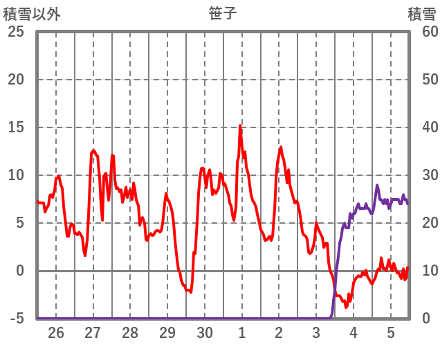 | 日 | 時 | 気温 | 降水 | 風向/風速 | 日照 | 積雪 | 降雪 |