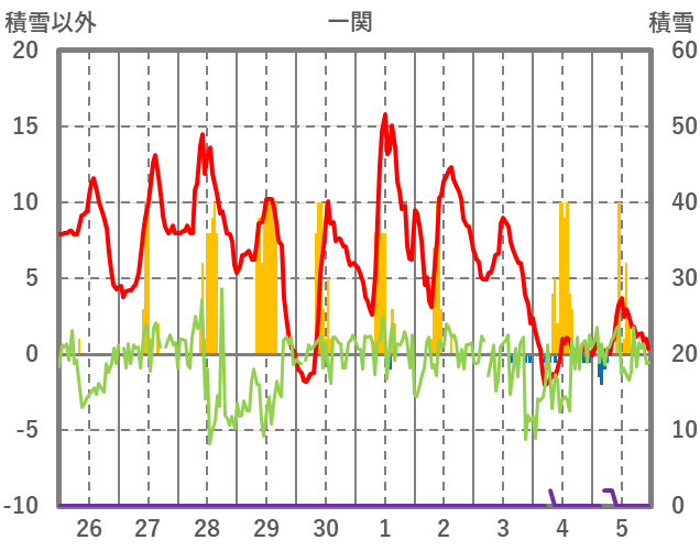 | 日 | 時 | 気温 | 降水 | 風向/風速 | 日照 | 積雪 | 降雪 |