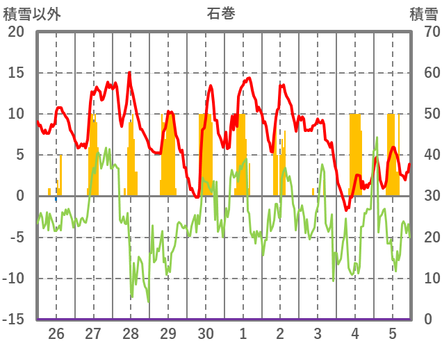 | 日 | 時 | 気温 | 降水 | 風向/風速 | 日照 | 積雪 | 降雪 |