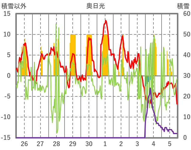 | 日 | 時 | 気温 | 降水 | 風向/風速 | 日照 | 積雪 | 降雪 |