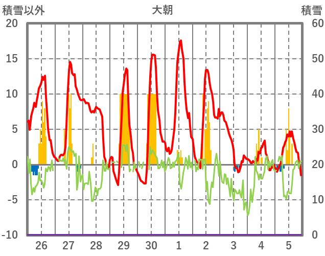 | 日 | 時 | 気温 | 降水 | 風向/風速 | 日照 | 積雪 | 降雪 |