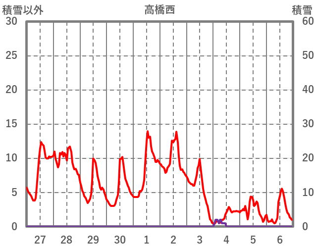 | 日 | 時 | 気温 | 降水 | 風向/風速 | 日照 | 積雪 | 降雪 |