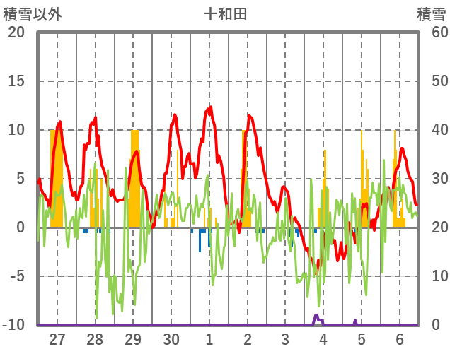 | 日 | 時 | 気温 | 降水 | 風向/風速 | 日照 | 積雪 | 降雪 |