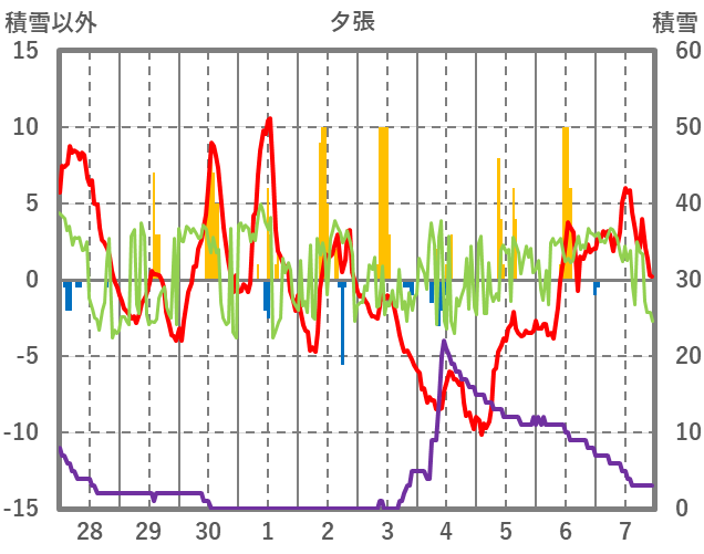 | 日 | 時 | 気温 | 降水 | 風向/風速 | 日照 | 積雪 | 降雪 |