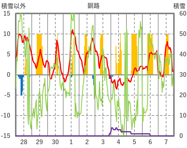 | 日 | 時 | 気温 | 降水 | 風向/風速 | 日照 | 積雪 | 降雪 |
