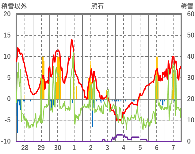 | 日 | 時 | 気温 | 降水 | 風向/風速 | 日照 | 積雪 | 降雪 |