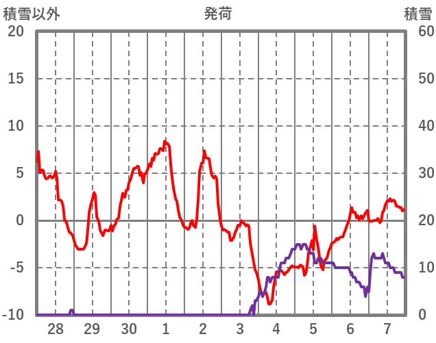 | 日 | 時 | 気温 | 降水 | 風向/風速 | 日照 | 積雪 | 降雪 |