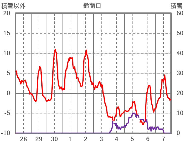 | 日 | 時 | 気温 | 降水 | 風向/風速 | 日照 | 積雪 | 降雪 |