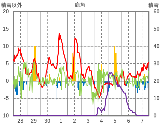 | 日 | 時 | 気温 | 降水 | 風向/風速 | 日照 | 積雪 | 降雪 |