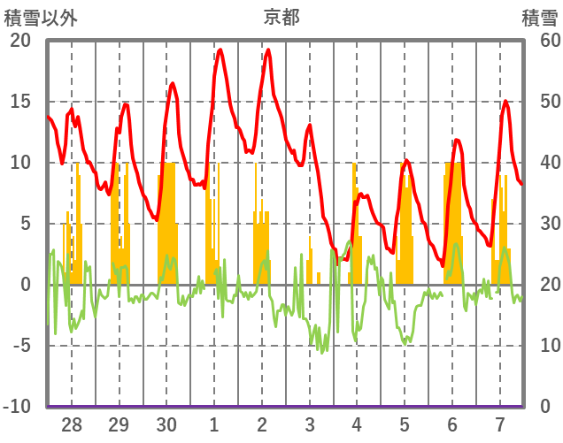 | 日 | 時 | 気温 | 降水 | 風向/風速 | 日照 | 積雪 | 降雪 |