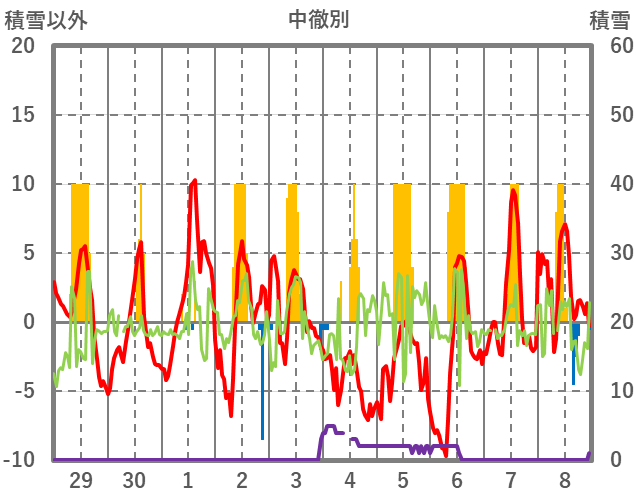 | 日 | 時 | 気温 | 降水 | 風向/風速 | 日照 | 積雪 | 降雪 |