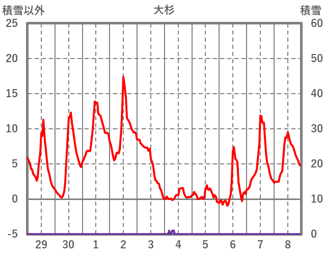 | 日 | 時 | 気温 | 降水 | 風向/風速 | 日照 | 積雪 | 降雪 |