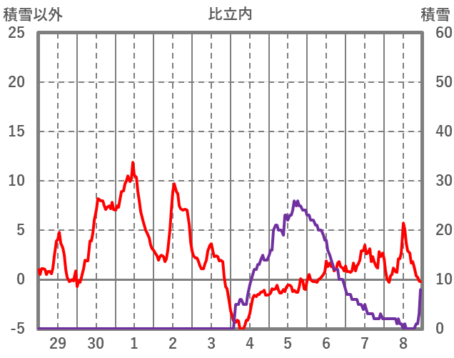 | 日 | 時 | 気温 | 降水 | 風向/風速 | 日照 | 積雪 | 降雪 |
