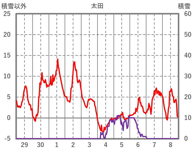 | 日 | 時 | 気温 | 降水 | 風向/風速 | 日照 | 積雪 | 降雪 |